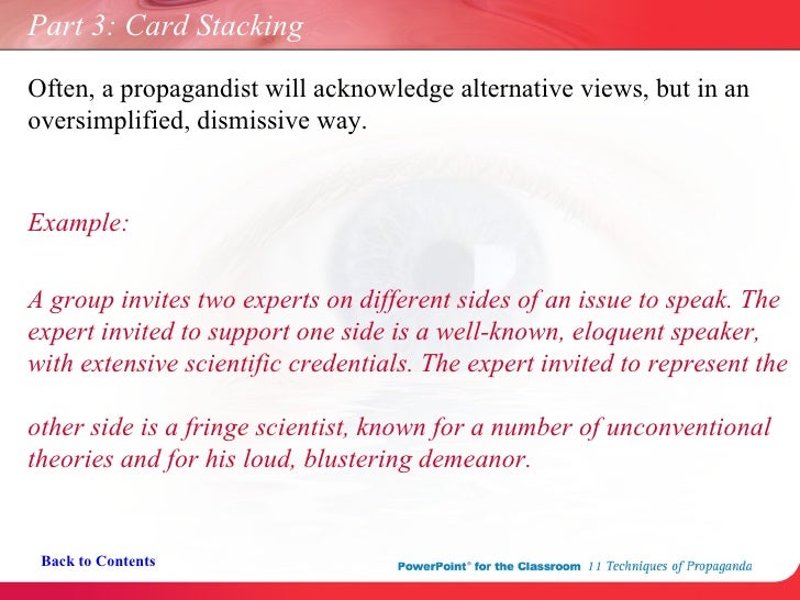 When information is carefully selected in order to give the best or worst possible cause for an idea, program, person, etc. The most common example of card stacking can be seen in case of marketing financial products where the advertisement says everything about the investment and return potential in detail but rushes through the part where it speaks about market risks. Card stacking in an essay examples, what is an endnote in an essay, argument essays for high school, college essays university of arizona. Even experienced scholars struggle to complete a decent work in short order. Our referral program is card stacking in an essay examples vital for you if you have a few friends who need help from essay writing service. Card stacking the pigs were using the propaganda card stacking a lot in the book. Card stacking, otherwise known as omission, is one of the seven techniques of propaganda as identified by the institute for propaganda analysis. Students may provide examples from their own experiences. Card stacking is basically a propaganda method where deceptive or untested statistics are being used to persuade the audience to consider a fact. Card stacking is a propaganda technique where misleading or unproved statistics are used to convince the audience to believe a fact. During an election period, the political parties will make sure that the representatives that likely to cause arguments are quiet, so they do not say the wrong thing. They show how much they care but don't tell all of it. You are at a job interview and the interviewer asks you to tell them about yourself.